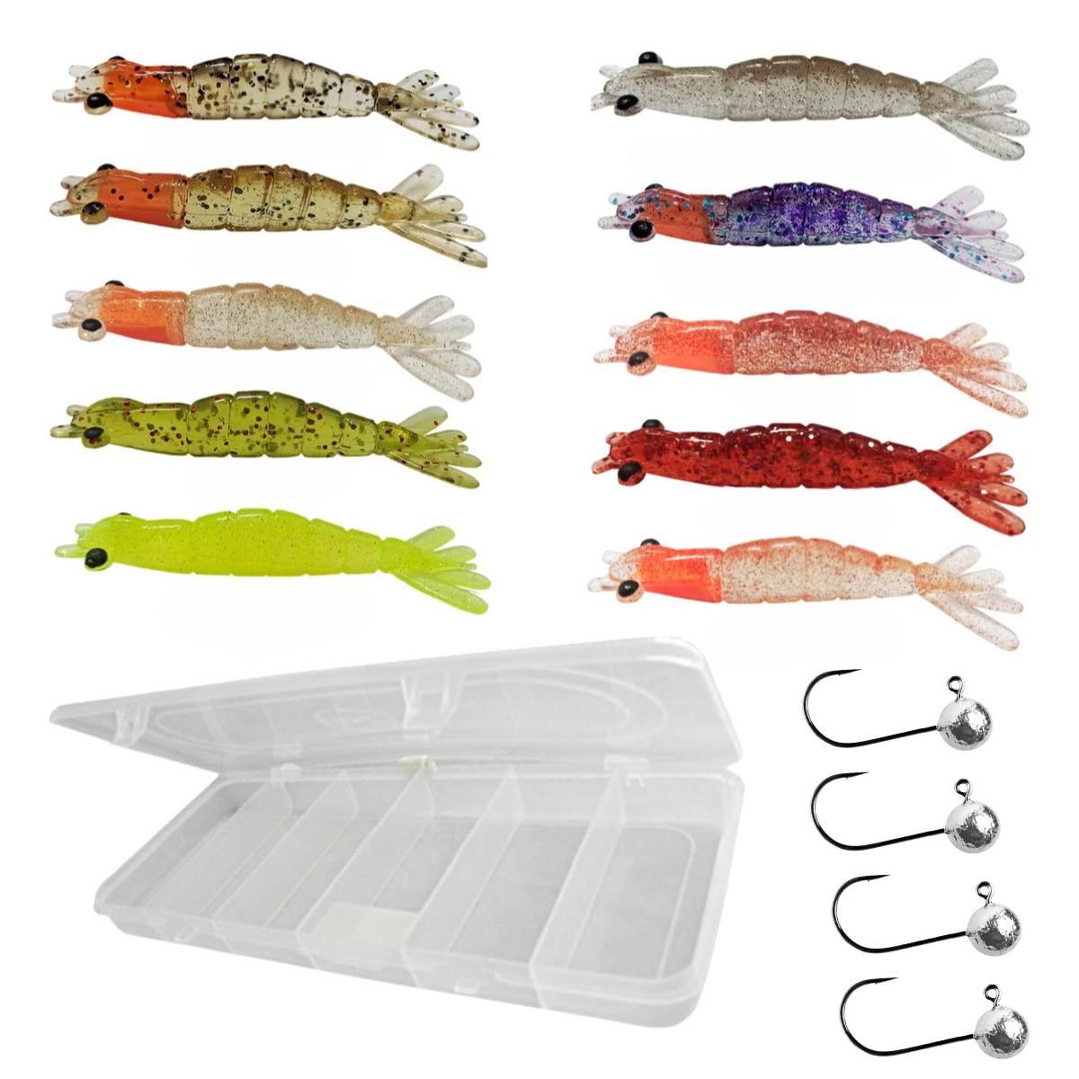 Kit 10pçs Camarão Robaleiro 8cm + Estojo Pesca Organizador 27x11cm 6 HI + JigHead - 4 unidades