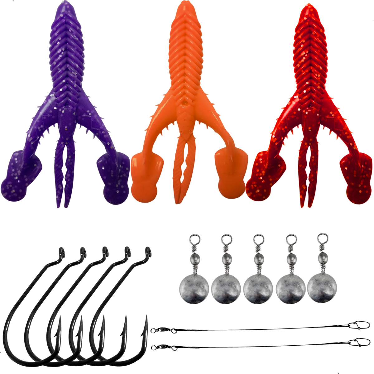 Kit 3 Iscas Craw Padlle + Anzol OffSet 4/0 5pçs + 2 Chicote + Down Shot 10g 5pçs
